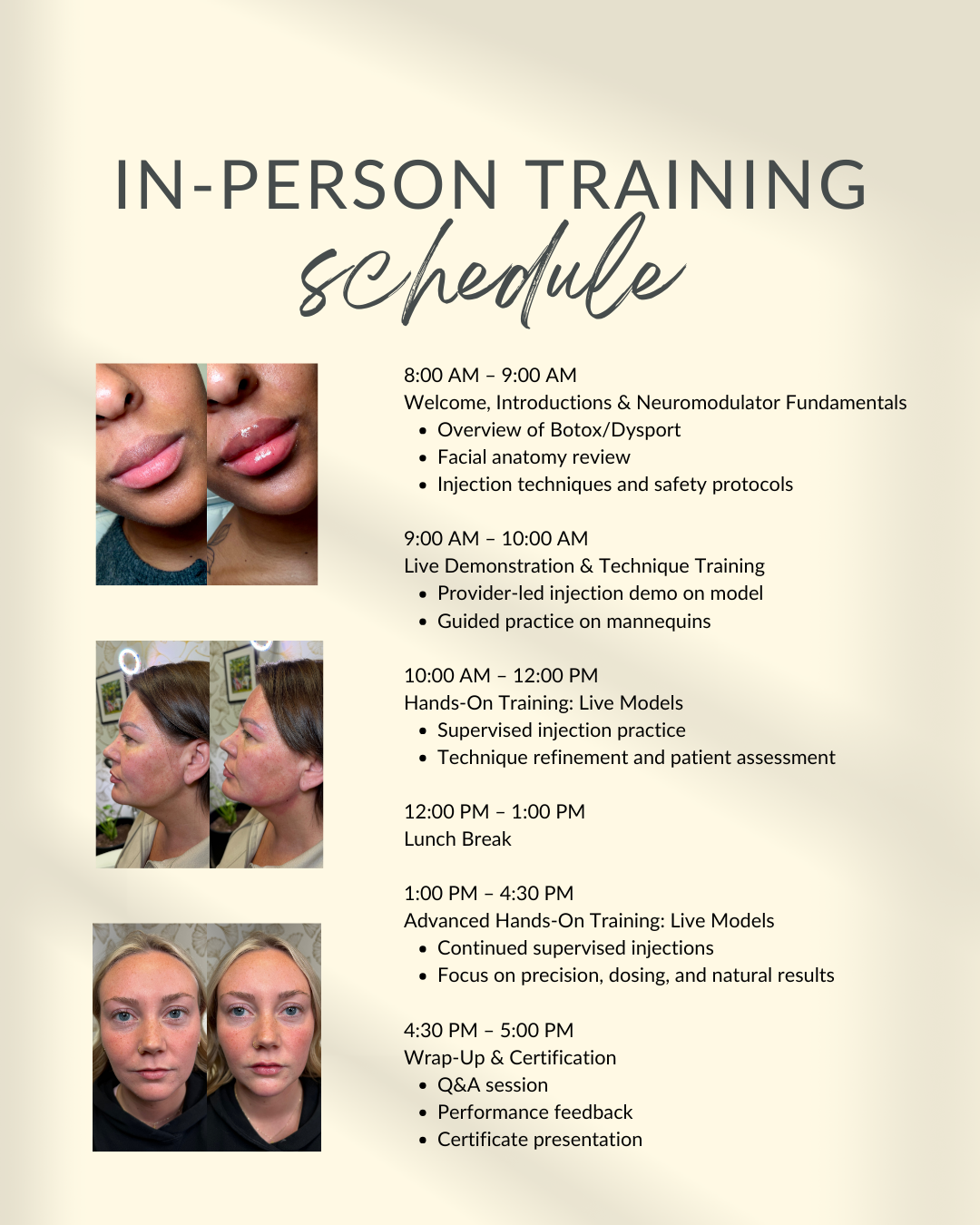 Students will begin by practicing on advanced, anatomically correct mannequins before progressing to guided, hands-on injections on live models under expert supervision. Our goal is for each participant to leave with both the confidence and competence to deliver natural, balanced results.